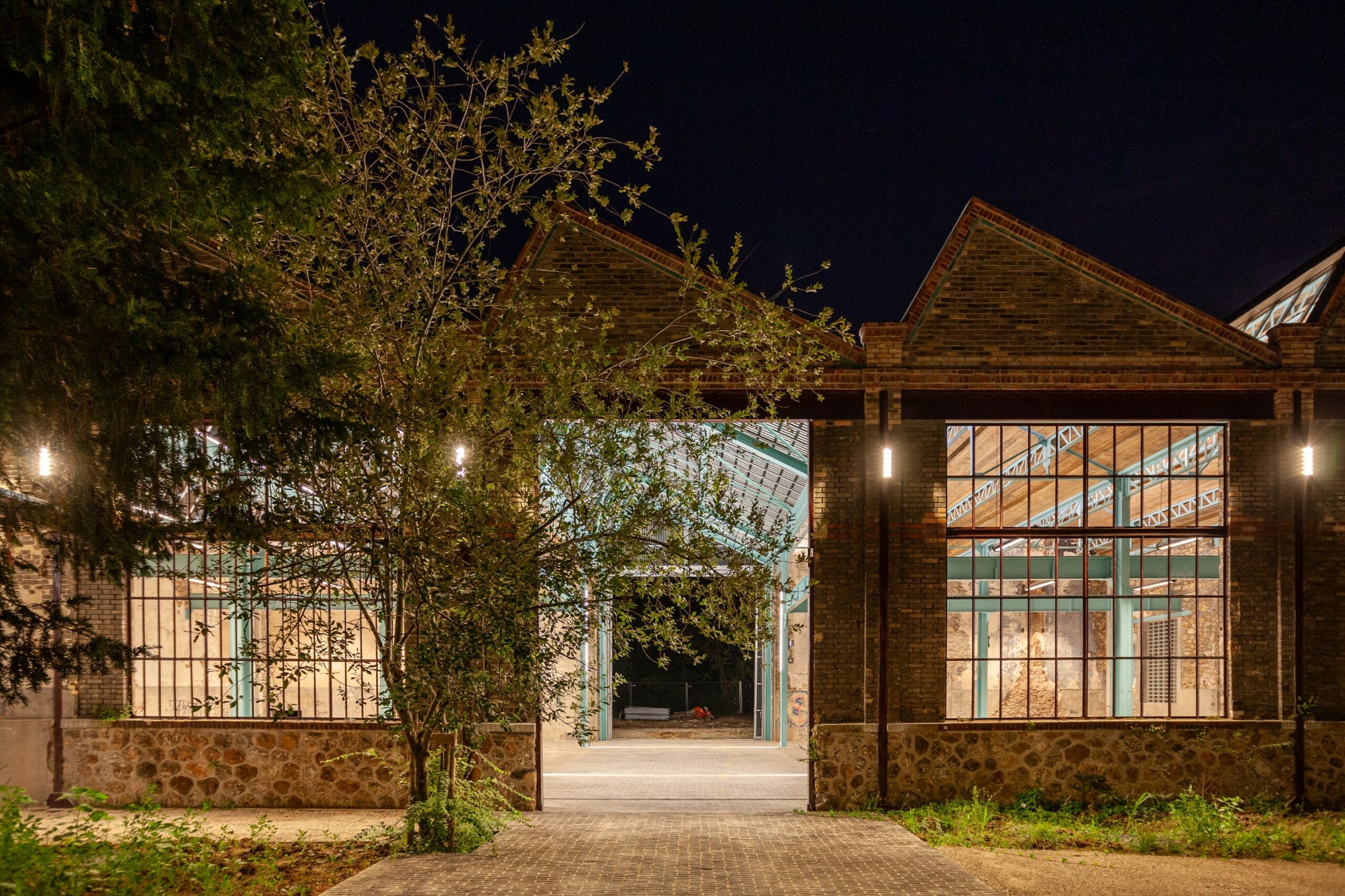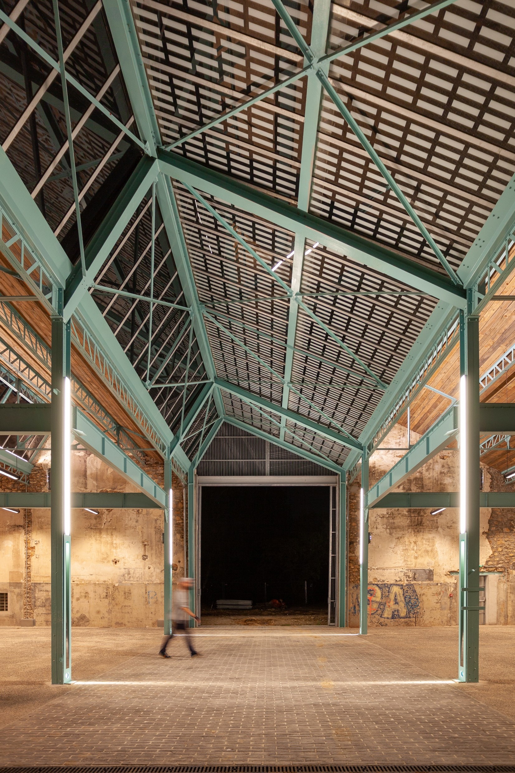La mise en lumière ponctuelle de la halle se glisse dans son site, entre trames bleue, trame verte et noire. Les luminaires sont défilés, la programmation en fonction exclusivement lors de l’usage de la Halle. Non usitée la halle dort.