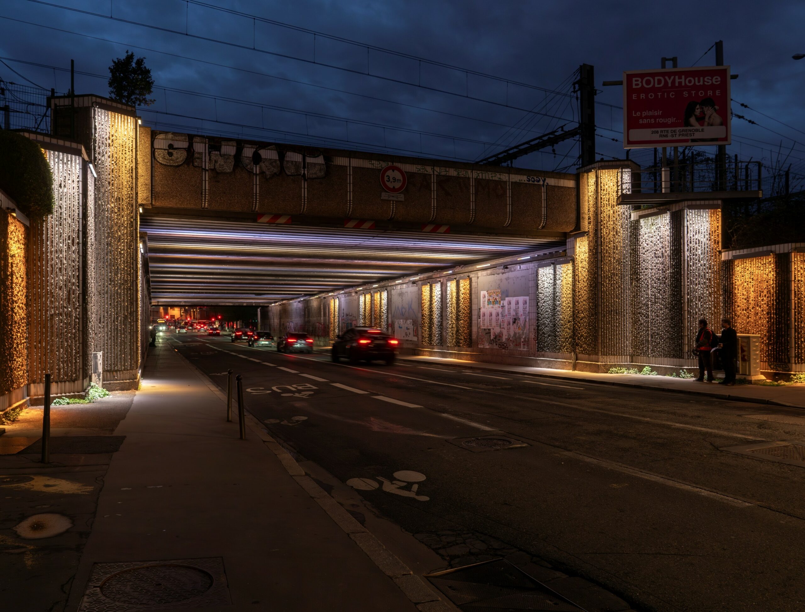 Notre intervention vient transformer l’ouvrage ferroviaire grâce à la lumière. S’appuyant sur l’héritage textile patrimonial Lyonnais, le concept repose sur un éclairage inspiré du tissu bayadère, un textile rayé et coloré.
