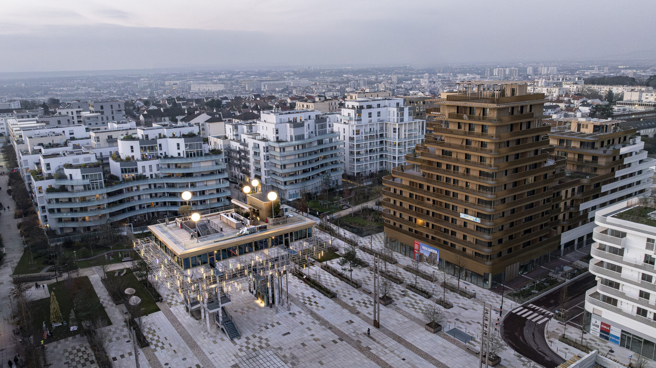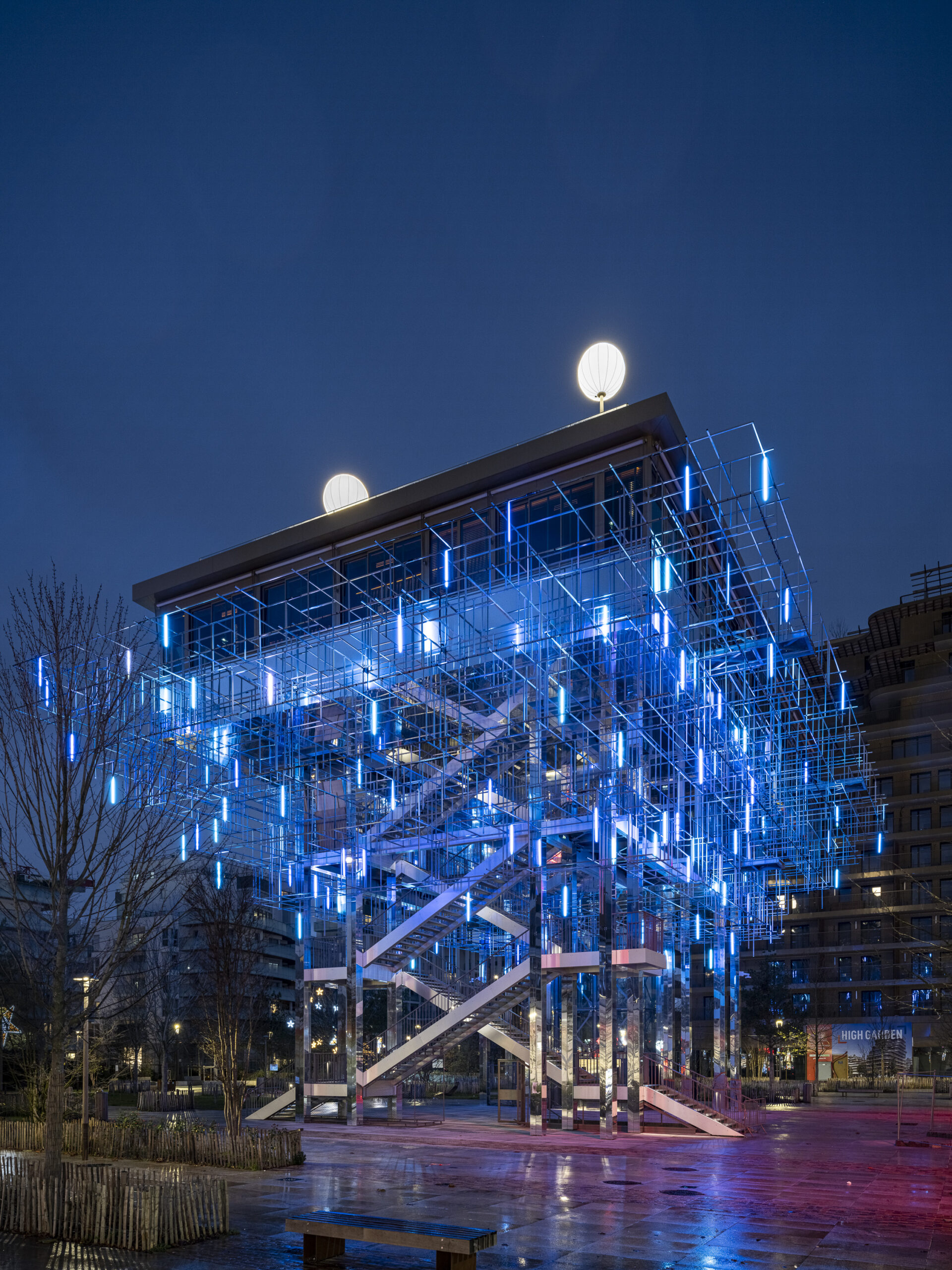Le bâtiment, monté sur pilotis, accueille un restaurant et un bar en rooftop qui offrent, tous deux, une vue panoramique imprenable sur son quartier jardin, le Mont Valérien, la forêt domaniale de la Malmaison, la Halle Gourmande et la gare de métro L15 du Grand Paris Express. Un dispositif technique tout autour de celui-ci permet de créer un nuage avec de la vapeur d’eau. Ce projet questionne deux enjeux nocturnes contradictoires où la place des usages doit composer avec la nécessité de protéger la biodiversité de la pollution lumineuse. Une programmation calendaire décline des effets lumineux selon les heures et saisons. Au fil de la soirée, le bâtiment s’éteint progressivement. Nous avons proposé un choix de spectres lumineux tenant compte des activités saisonnières de la biodiversité sur un principe de réciprocité qui partage l’année en deux périodes : l’une où la biodiversité est à l’honneur (biodiversity friendly) et l’autre où l’humain privilégie son besoin de lumière artificielle (human-friendly). 180 traits lumineux sont suspendus dans la résille 3D et s’animent à la nuit tombée (réglettes Leds RGBW avec deux faces lumineuses, longueurs de 80 cm, pilotées en DMX via un contrôleur Pharos). Les matériaux choisis pour démultiplier les effets lumineux nous permet de contenir la puissance électrique à moins de 1 500W de puissance nominale.