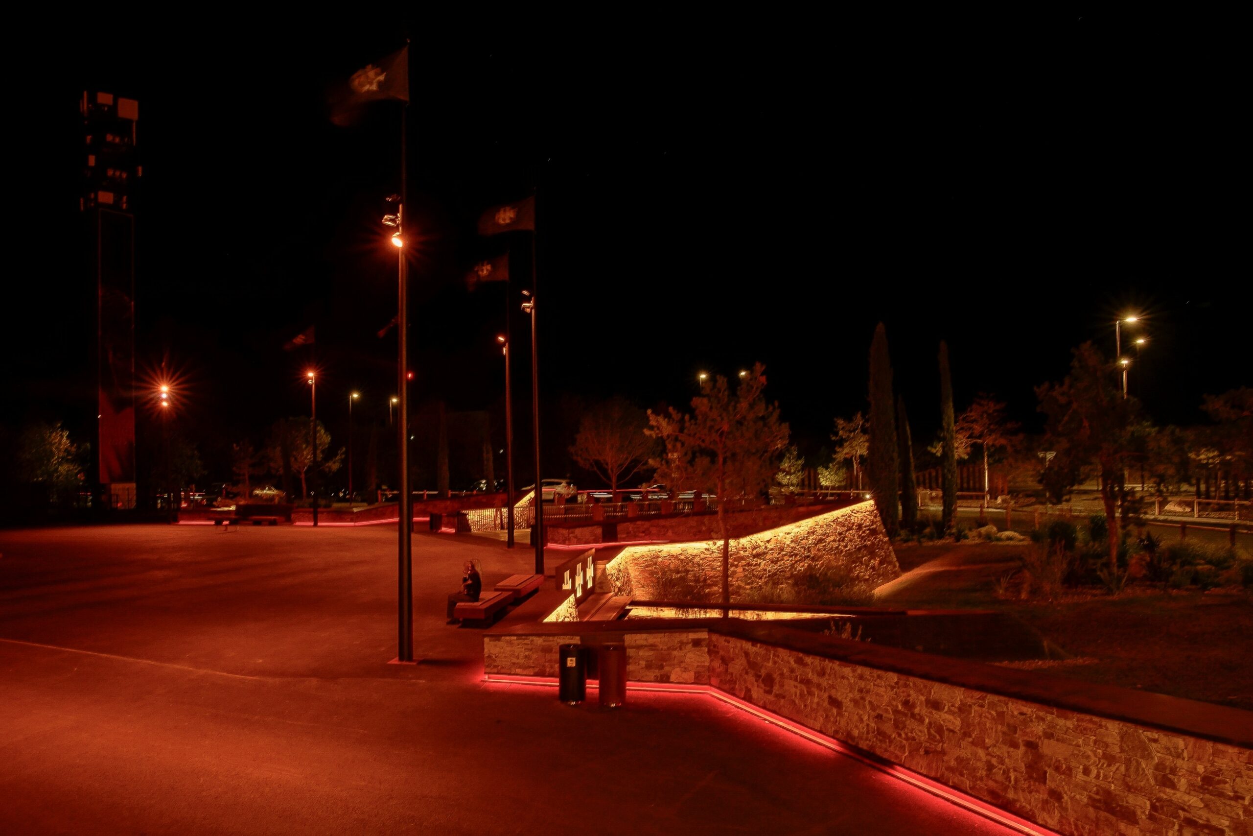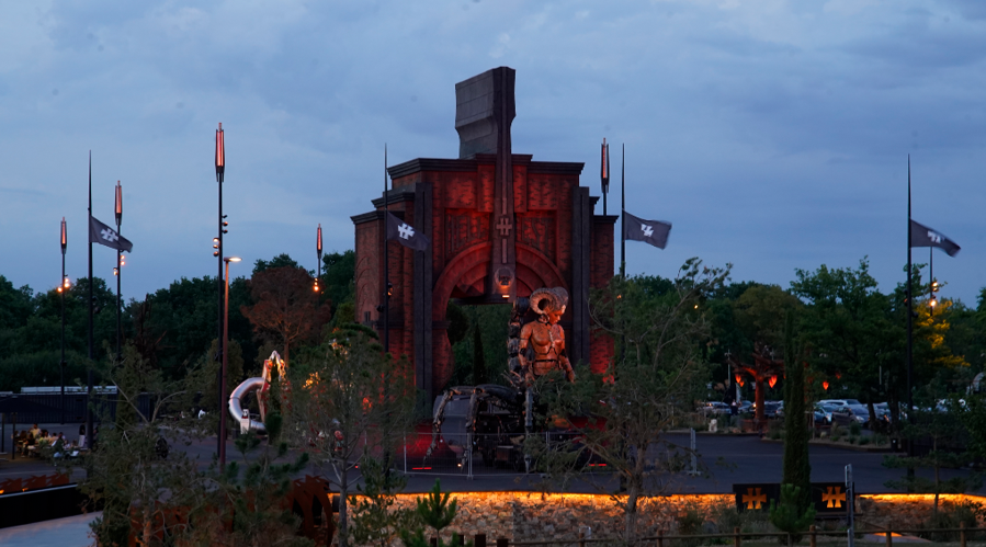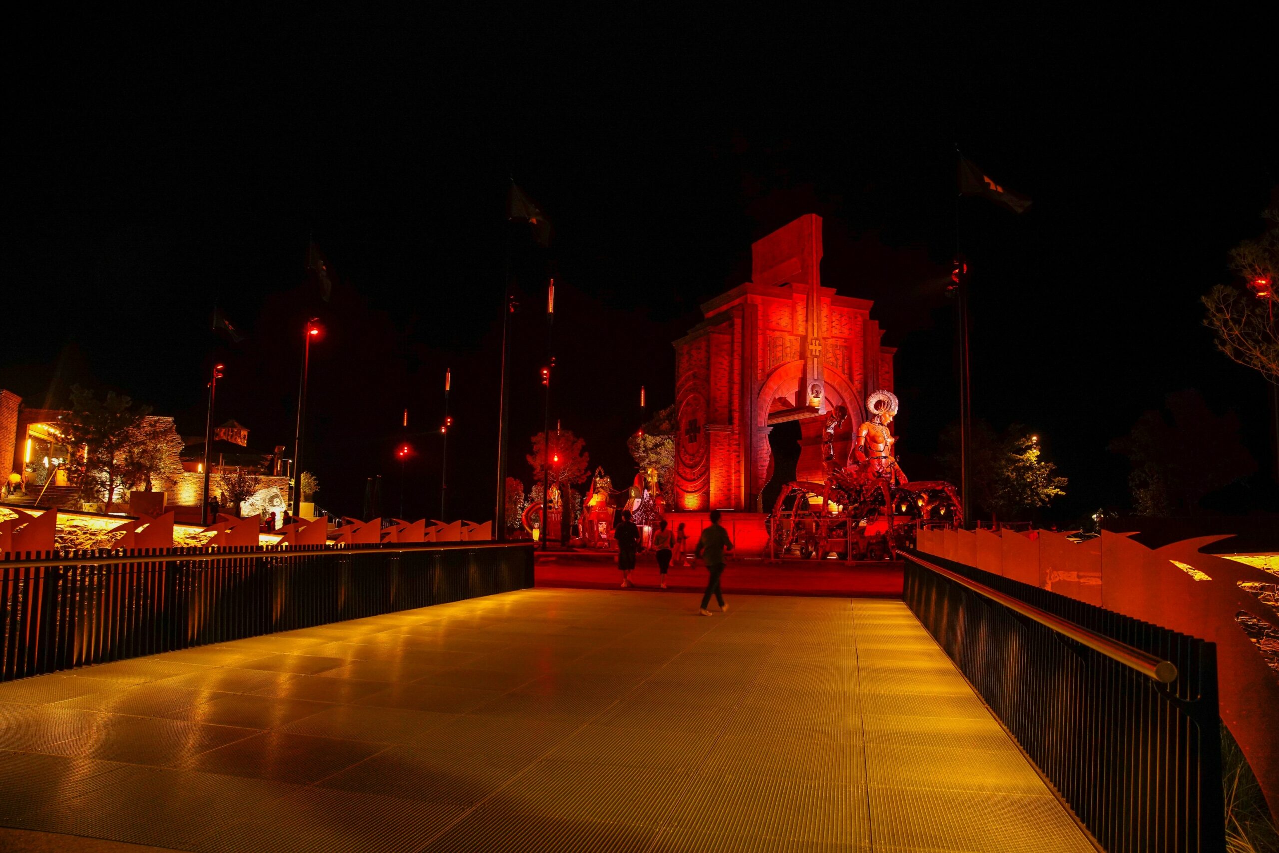 En franchissant la passerelle ses griffes de corten éclairées nous transportent sur le parvis cerné d’une ligne de lumière marquant la limite, des drapeaux flottent et les mâts qui les supportent éclairent le parvis noir bitume, on perd pied, l’immersion dans les ténèbres à commencée. En arrière plan l’attraction est totale, l’arche des guitares héros, à la lumière sous jacente encadre parfois la gardienne captivante. Succède ensuite comme appel au lointain, un double alignement de six mâts torchères, dessinées pour l’occasion, l’aire de jeu Pandemonium. Les temples qui le composent vibrent sous la lumière et respirent au rythme des incantations ludiques.