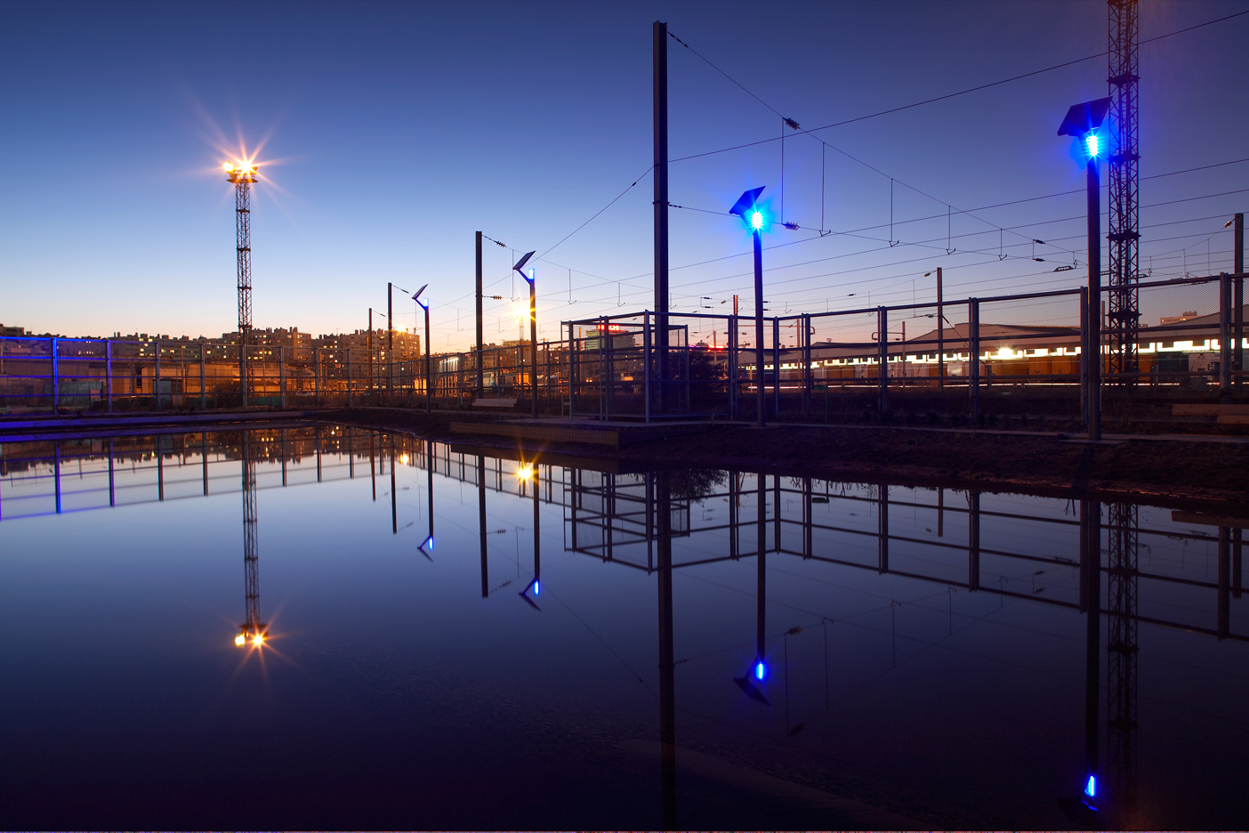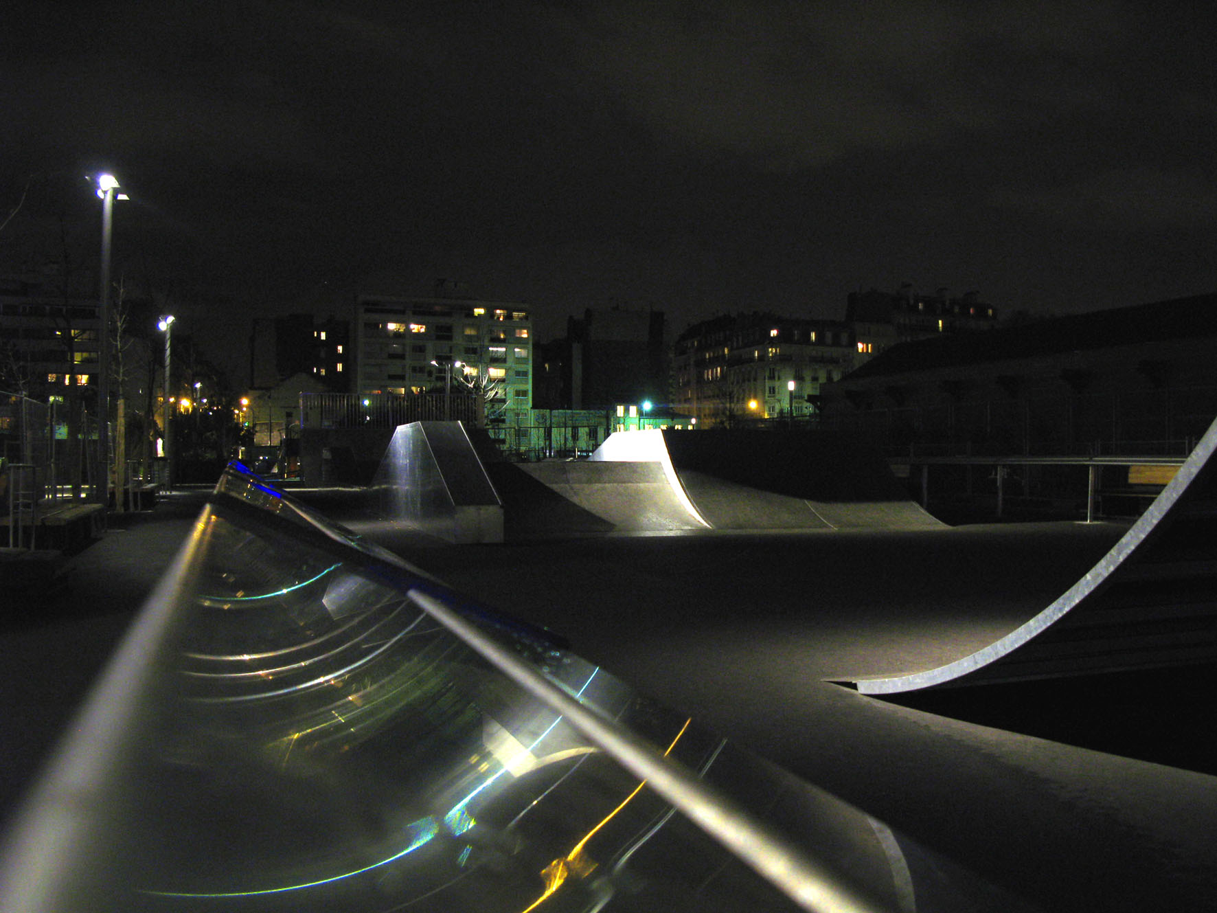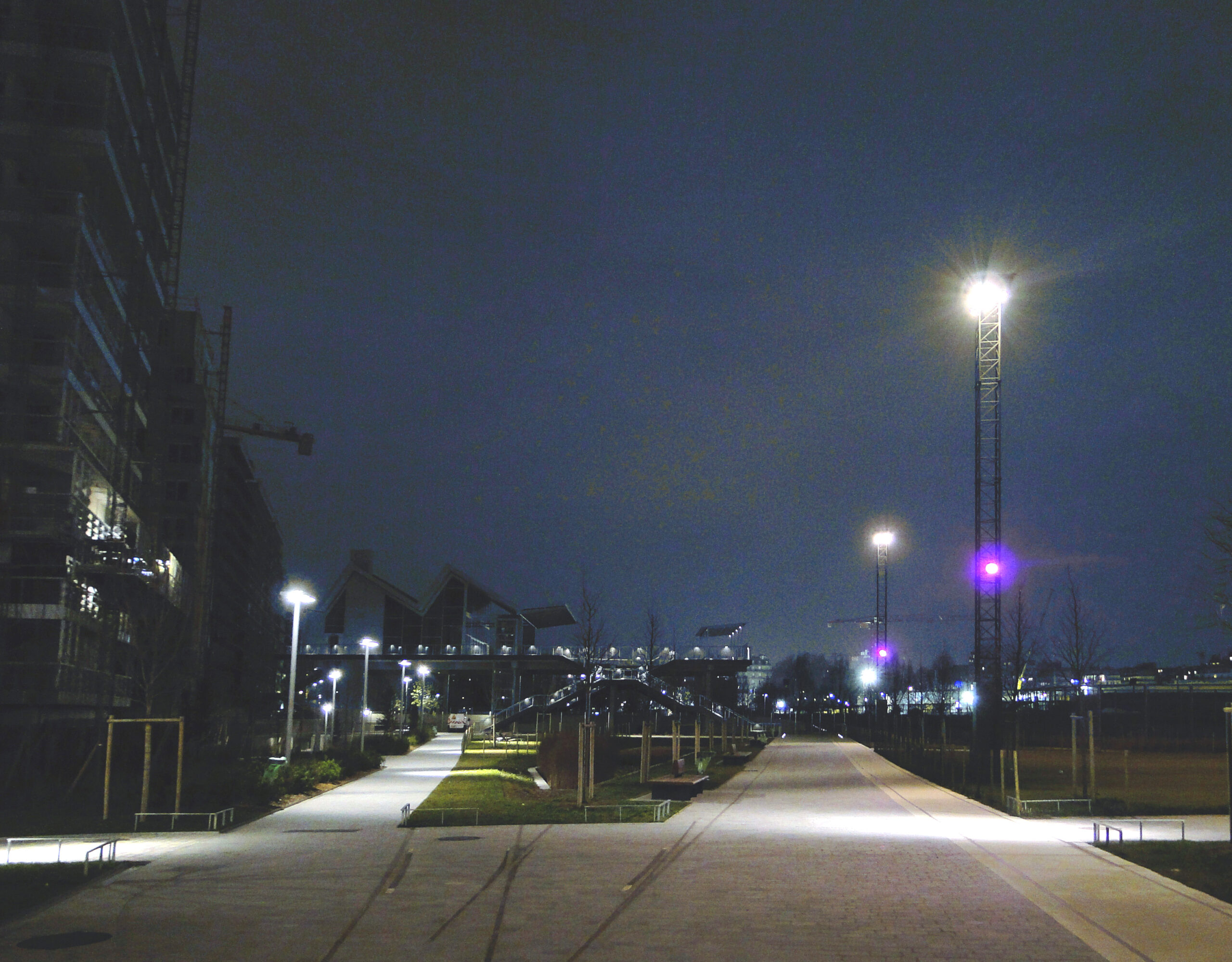 La transformation de la friche ferroviaire située dans la Zac Clichy Batignolles a été initialement imaginée pour accueillir le village olympique, lorsque Paris était encore Ville candidate pour 2012. L’éclairage du parc Martin Luther King a donc été conçu afin de borner visuellement les limites provisoires du site contigu aux larges emprises ferroviaires, d’y créer des ambiances nocturnes diversifiées et attrayantes et d’agrémenter l’image nocturne du parc visible depuis les immeubles riverains. Conformément au Schéma directeur d’aménagement lumière de la Couronne parisienne, la petite ceinture ferroviaire qui déploie une large courbe en rive des bassins Nord du parc a été surlignée à l’aide de balises lumineuses bleues fixées sur des mâts en bois de six mètres de hauteur à alimentation autonome photovoltaïque.Le grand axe diagonal qui traverse et dessert tout le parc est éclairé à l’aide d’un système de projecteurs orientables fixés sur des grands mâts, typiques en référence aux antennes voies ferrées. L’éclairage du parc a été abordé avec une préoccupation constante de développement durable et de haute qualité environnementale grâce une extinction progressive des éclairages, dans le respect des espèces animales et végétales, l’objectif de leur non perturbation et avec la volonté de ne pas accroître la pollution lumineuse à Paris.