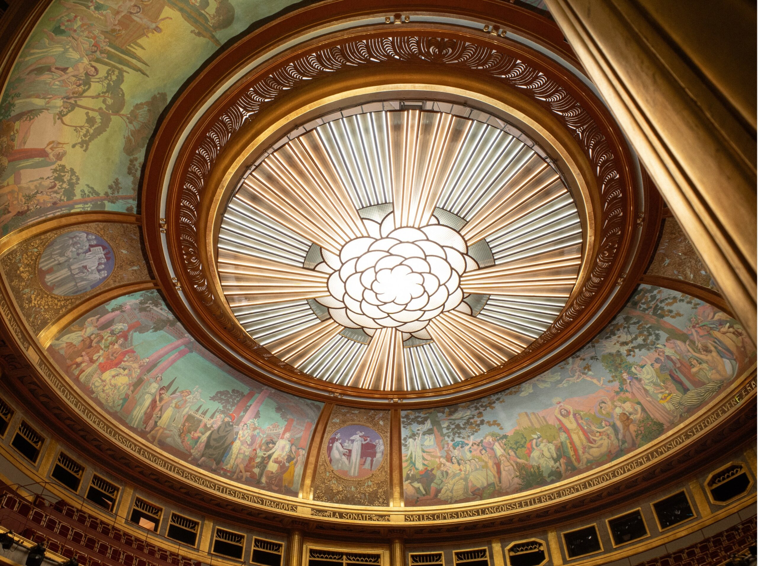 Le planning est très court et le « lustre » est la source de lumière principale de la salle. L’éclairage doit promulguer des niveaux règlementaires pour l’accessibilité, valoriser et préserver les peintures de Maurice Denis, pouvoir générer des effets évènementiels sans recours à du matériel tiers et être peu énergivore. Les travaux doivent s’opérer dans le respect du patrimoine bâti.