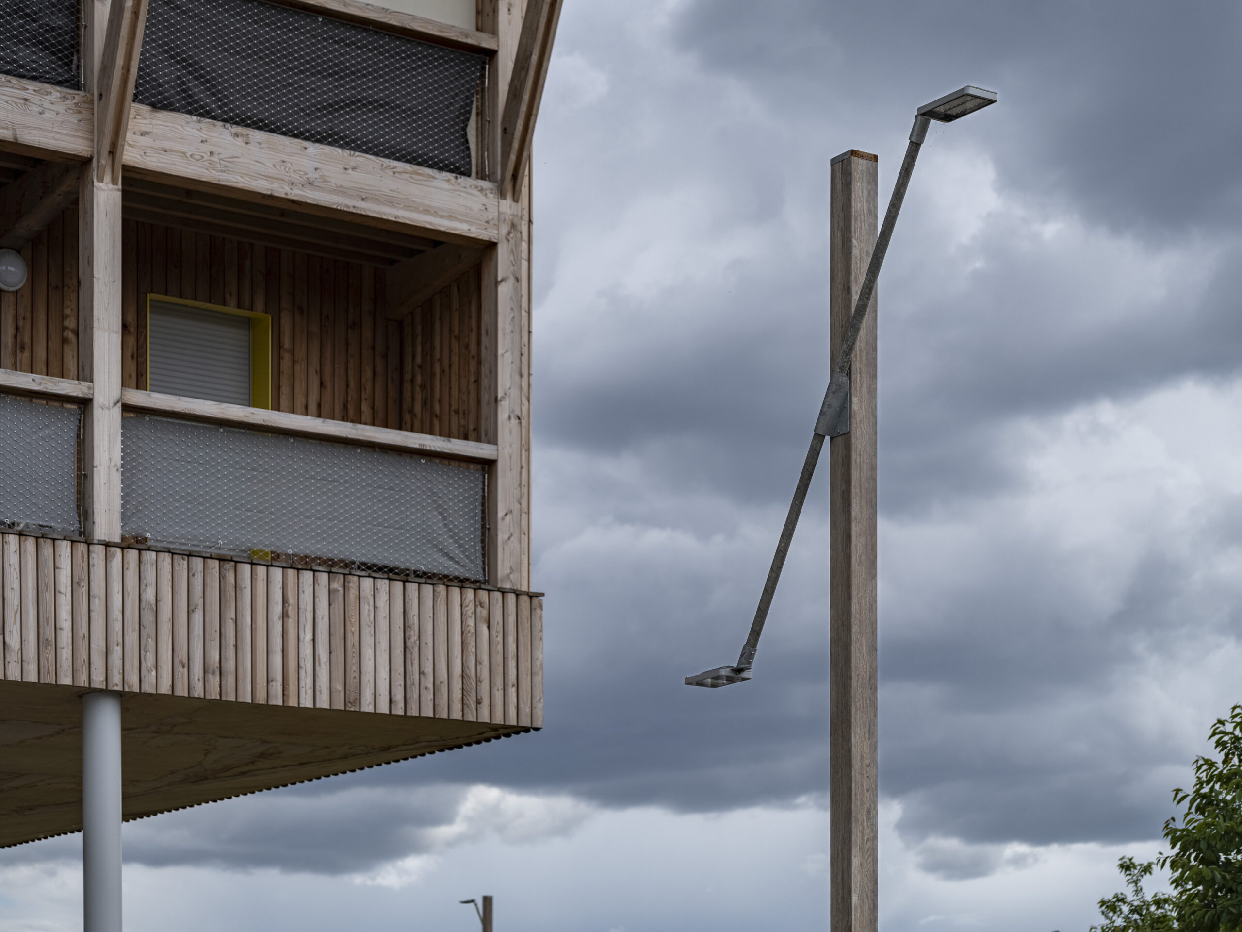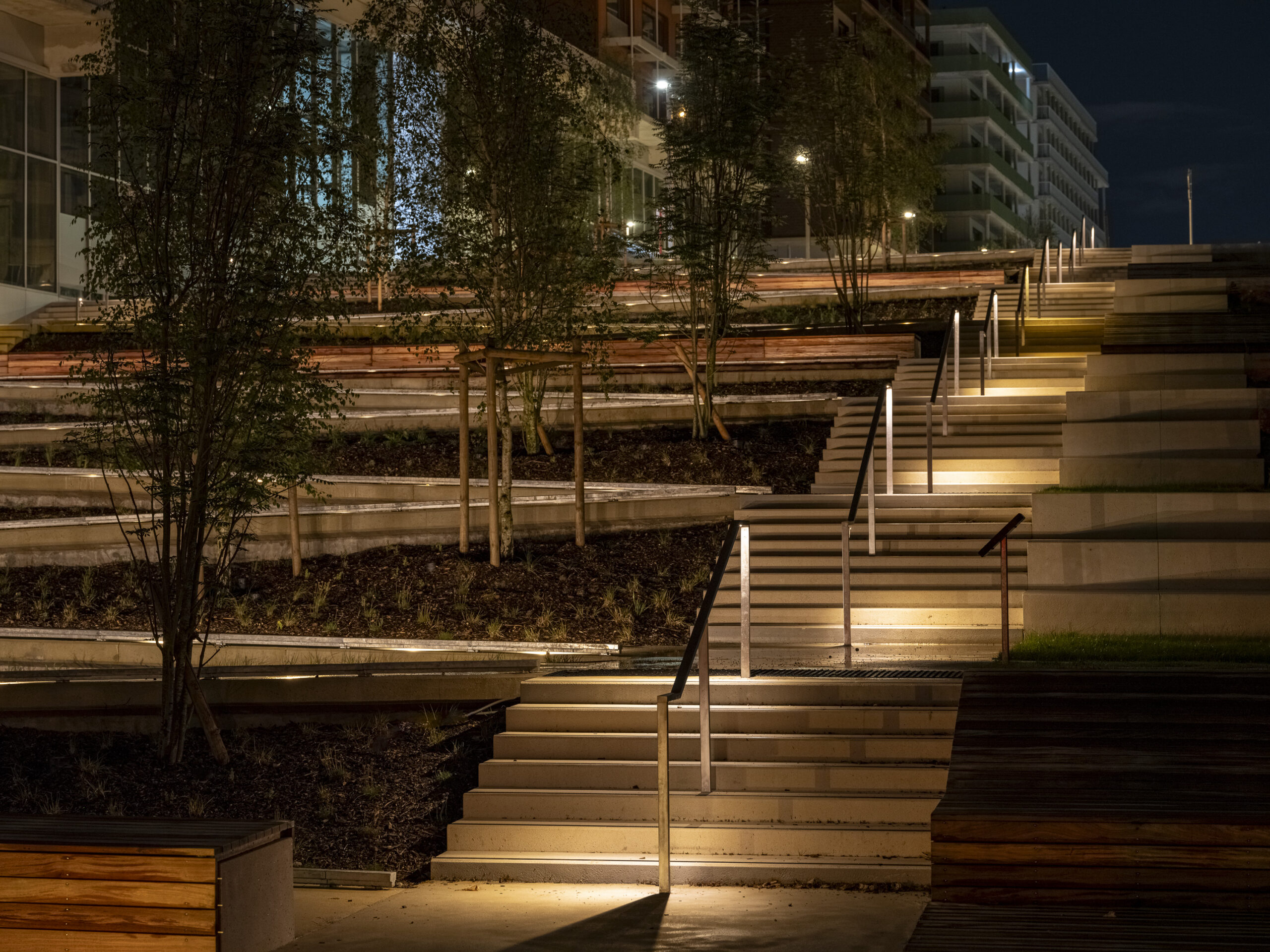 Dans le cadre des jeux olympiques et paralympiques de Paris 2024, le village des athlètes accueillera environ 15 000 sportifs pendant un mois. D’une superficie de 51ha, à cheval sur les communes de Saint-Denis, Saint-Ouen ce quartier porte de fortes ambitions : végétalisation des espaces publics, maitrise du bilan carbone, prise en compte du réemploi, stratégie d’accessibilité universelle, réversibilité des espaces publics en « héritage », après les JOP. Le récit nocturne du village des athlètes repose sur objectifs : La « trame noire », qui a défini des zones de sauvegarde de l’obscurité, et par là même de la biodiversité. Elle accompagne la renaturation d’espaces publics et l’équilibre recherché entre lumière et obscurité, répond à un cahier des charges technique précis (spectre lumineux, intensité…) La décarbonation des ouvrages d’éclairage avec l’utilisation de mâts en bois et d’éléments issus du réemploi (mâts d’éclairage et tubes d’échafaudage recyclés) afin de réduire de 50% l’impact carbone de l’installation. Et une volonté très forte d’intégrer l’éclairage aux aménagements ce qui réduit l’utilisation de matière à la source d’éclairage (points lumineux intégrés dans les rambardes, bordures). La mémoire du site olympique en phase héritage grâce aux mises en lumière ludiques de la place Ampère et de la rampe olympique. Cette dernière est une installation interactive et expérientielle qui renforcera la mémoire de la fête olympique.